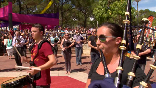 Pipe Bands WA staged a surprise flash mob stunt at Curtin University as a novel way to publicise its upcoming State Championships. Students were curious to watch a lone drummer walk out onto the courtyard near the library building, and then a little astonished when a young female student picked up bagpipes to play along. But when seven separate pipe bands started marching from different directions of the campus, the whole university suddenly became engaged.